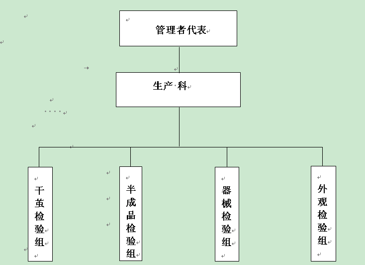本公司確立以管理者代表負(fù)責(zé)的質(zhì)量管理組織,設(shè)立符合產(chǎn)品質(zhì)量要求的管理部門,由生產(chǎn)科全面負(fù)責(zé)公司的產(chǎn)品質(zhì)量。下設(shè)四個組,即干繭檢驗組、半成品檢查組、器械檢驗組、外觀檢驗組。